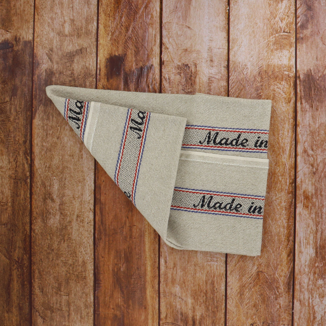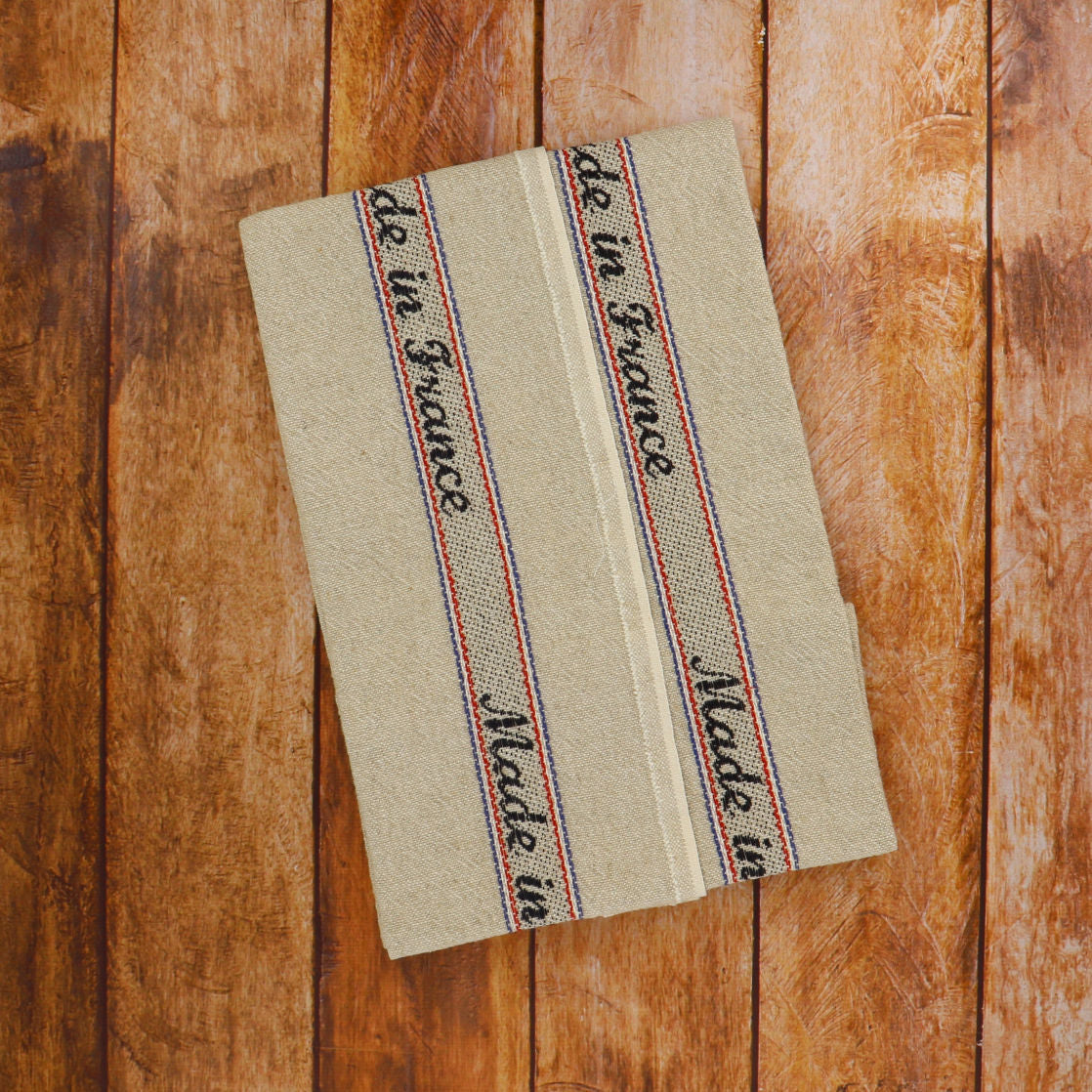 This kitchen towel made of linen and cotton is very absorbent and resistant. It has two printed stripes on each side with the words "made in France" underlined in blue, white and red. It is used to clean and machine washable at 90°.